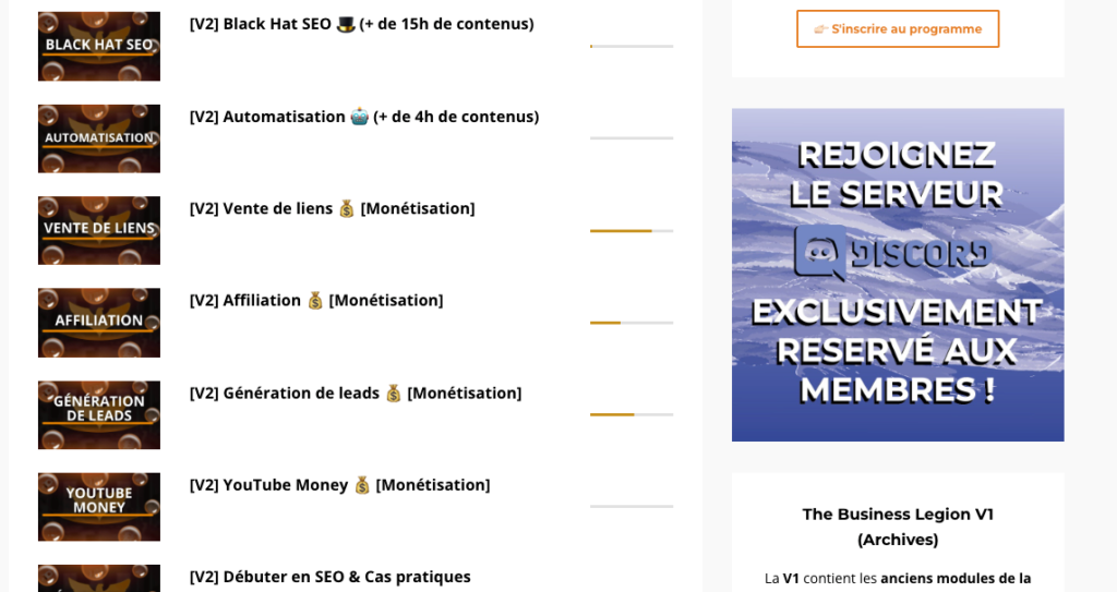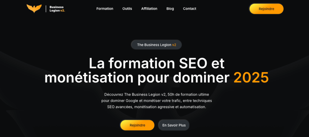 Cette année, j’ai franchi le pas et j’ai acheté The Business Legion V2. Et je vais être très clair : quand on a déjà un niveau avancé, acheter une formation SEO n’est pas évident. On se demande toujours si l’on va tomber sur une énième version des mêmes bases, ou si l’on va réellement apprendre quelque chose.